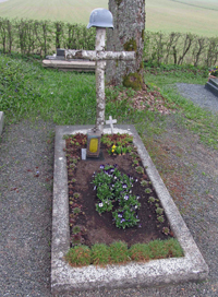 Nurn, Markt Steinwiesen, Landkreis Kronach, Oberfranken, BayernPLZ 96349 Einzelgrab ohne Namen mit Birkenkreuz und Stahlhelm (2. Weltkrieg), Grab bezeichnet mit Nr. 37, auf dem Ortsfriedhof