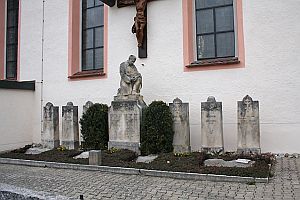 Bei der Kirche; Denkmal, oben mit Steinrelief „knieender Soldat“, flankiert von sechs Steintafeln mit je einem Namen; zusätzlich Hinweise zu Soldaten von privaten Gedenksteinen