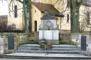 Wikipedia: „In einer Nische der Mauer, die die Marienkirche umgibt, steht das Denkmal für die Gefallenen der beiden Weltkriege. Es wurde am 10. September 1922 eingeweiht. Im Sockel des Denkmals sind 30 Namen von Gefallenen des Ersten Weltkrieges mit Herkunftsort, Dienstgrad, Datum und Ort des Todes eingemeißelt. Auf dem Sockel ruht ein Sarkophag. An ihm sind die Jahreszahlen 1914 und 1918 zu sehen sowie ein Lorbeerkranz. (…) Das Denkmal wird gekrönt von der sehr realistischen Darstellung eines sterbenden Soldaten. Rechts und links sind an den Mauernischen (Tafeln für den 2. Weltkrieg) angebracht. Die beiden Linden, die heute das Denkmal flankieren, wurden 1933 – wie vielerorts üblich – anlässlich der Machtergreifung Adolf Hitlers gepflanzt.“