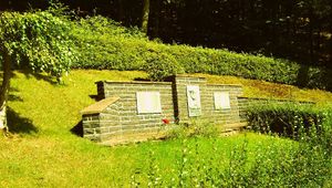 Denkmalwand aus Bruchsteinen, mit zwei Flügelarmen, zwei reliefartigen, bronzenen Namenstafeln und einer dritten Bronzetafel mit Inschrift und Relief.