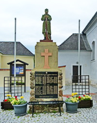 Quadratischer Natursteinsockel gekrönt mit der Statue eines auf ein Gewehr gestützten Soldaten neben der Kirche.