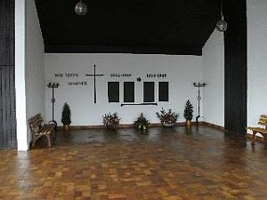 In der Aussegnungshalle sind ein Kreuz, Inschrift, Jahreszahlen sowie vier Namenstafeln an der Wand angebracht. Alle Teile sind aus Metall gefertigt.