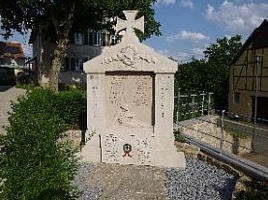 Einem Tempeleingang nachempfundenes Kriegerdenkmal. An den Säulen, nach unten zeigende Schwerter die von Lorbeerästen umrankt werden. Im Eingang ein sterbender Soldat. Im Dach ein Stahlhelm mit Lorbeer/Eichenlaubkranz und Fahnen. Als Abschluß ein deutsches Kreuz.
