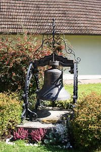 Bei der Kirche; auf einem Sockel Glocke an einer schmiedeeisernen Halterung, Messingplakette am Sockel