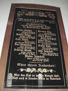 Denkmal ohne Namen für die Gefallenen des 2. Weltkriegs auf dem Friedhof. Gedenk- und Ehrentafeln in der Kirche. Ehrenliste für die Gefallenen des 1. Weltkriegs.
