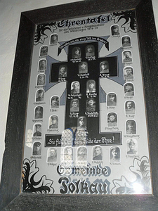 Ehrentafel 1. Weltkrieg: Ehrentafel für die Gefallenen u. Kriegsteilnehmer des Weltkrieges 1914-18 (Namen Gefallene) Wir wollen sein ein einig Volk von Brüdern! (Namen Kriegsteilnehmer) Sie fielen auf dem Felde der Ehre! Gemeinde Polkau