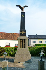 Stele auf quadratischen Sockel gekrönt mit Adler am Hauptplatz.