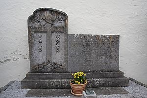 Bei der Kirche; auf einem zweistufigem Podest Steinplatte, linker Teil erhöht mit Kreuz und Stahlhelm; zusätzlich Hinweise zu Soldaten von privaten Gedenksteinen