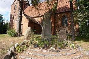 Vor der St.-Johannes-Kirche (Backsteinbau aus dem 14. Jh.) steht ein dreiteiliges Denkmal aus Findlingen;
