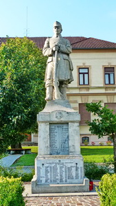 Soldatenstatue auf quadratischen Sockel am Hauptplatz.