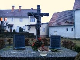 Das Kriegerdenkmal besteht aus einem Kreuz in der Mitte. Zu beiden Seiten sind Namenstafeln aus Metall in Steinblöcke