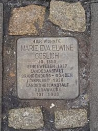 Geltow (Stolperstein), Gemeinde Schwielowsee, Landkreis Potsdam-Mittelmark, BrandenburgPLZ 14548 Vor dem Grundstück eines Hauses in Alt – Geltow an der Straße Am Wasser (ehemals Havelstraße 4) befindet sich ein Stolperstein zur Erinnerung an eine Fotografin und Redakteurin, die ein Opfer der Euthanasie wurde.