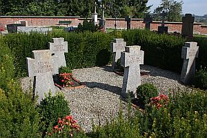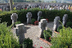 Im Friedhof; zwei mit Hecken abgegrenzte Bereiche, getrennt für 1. Weltkrieg und 2. Weltkrieg; drinnen Steinkreuze mit Namen