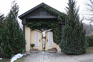 Im Friedhof eine offenen Gedenkkapelle, Vordach auf zwei Säulen getragen, Gedenktafeln, in der Mitte Kreuz mit Heiland;