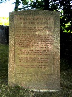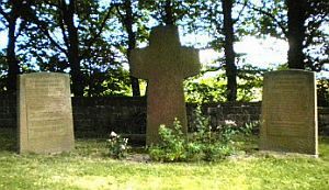 einem Kreuz aus grob behauenem Sandstein, links und rechts davon zwei Sandsteintafeln mit Inschriften.