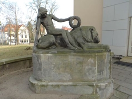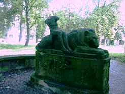verwahrlosten Zustand. Der Figur auf dem Löwen fehlen Kopf und Arme, das Denkmal stark beschmiert, die