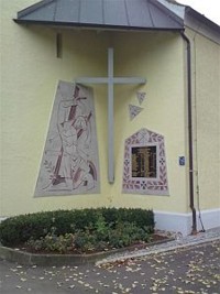 Kreuz mit Bild und Wandtafel in einer Nische der Pfarrkirche in Schönau