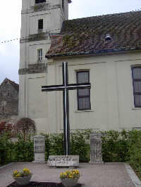 Auf dem Friedhof bei der Kirche ein hohes schlichtes Kreuz aus