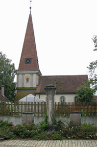 Das Steindenkmal steht vor der evang. Kirche. Die zentrale Säule trägt die Inschrift, die flankierenden Steinquader Namen und Daten der Opfer beider Weltkriege.