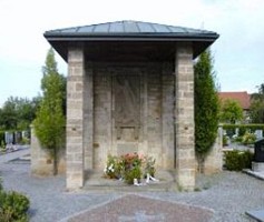 Offene Kapelle auf dem Friedhof. An der Wand eine Sterbeszene aus Sandstein. Quelle: Sennfeld, Geschichte eines
