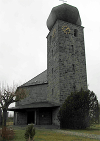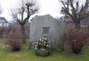 Seußen (ohne Namen), Stadt Arzberg, Landkreis Wunsiedel i.Fichtelgebirge, Oberfranken, BayernPLZ 95659 Granitstein mit Metallplatte vor der Gustav-Adolf-Kirche am Ortsrand
