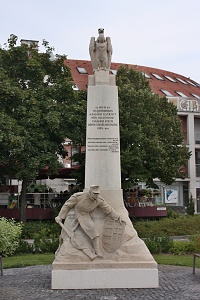 Steinsäule an Fö ut./Ecke Kele ut., auf Säule Adler, am Fuß Soldat mit Gewehr und Wappen, Inschrift auf Vorderseite, Namen links und rechts auf den Seiten der Säule