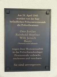 Gedenktafel erinnert an vier homosexuelle Polizisten, die in den letzten Tagen des zweiten Weltkrieges Opfer