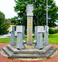 Auf einem regelmäßigen Hexagon-Fundament neben der Kirche erhebt sich im Zentrum eine Säule gekrönt mit EK und dem Relief der Pieta. Rundherum stehen sechs Säulen mit Namenstafeln.