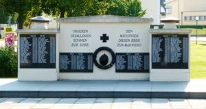 Am Hauptplatz eine freistehende Wand mit Namenstafeln für den 1. Welktrieg, in der Mitte Eisernes Kreuz und Lorbeerkranz aus Metall sowie ein Stahlhelm, flankiert von zwei rechteckigen Blöcken mit Namenstafeln für den 2. Weltkrieg.