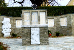 Unterhalb der Kirche eine aus Natursteinen gefügte Wand gekrönt mit Eisernem Kreuz sowie mit eingefügten Namenstafeln und einem Relief mit Soldatenköpfen. Davor altarähnliches Podest.