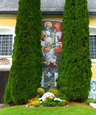 In ein großes Mosaik an der Kirchenaußenwand, das den Hl. Michael darstellt, integrierte Namenstafeln zum Großteil von zwei riesigen Koniferen verdeckt.