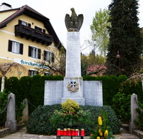 Stele auf Sockel neben der Kirche gekrönt mit Adler, flankiert von 2 Tafeln eingefriedet mit Säulen und Ketten.