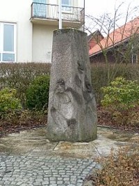 Ein Basaltsteindenkmal mit Figurenreliefs zeigt die Namen der Opfer beider Weltkriege.