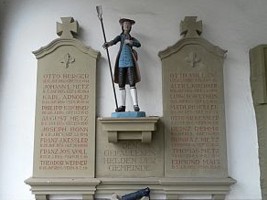 An der Außenwand der St. Sebastian-Kirche hängen Sandstein-Namentafeln für die Opfer des ersten Weltkriegs.