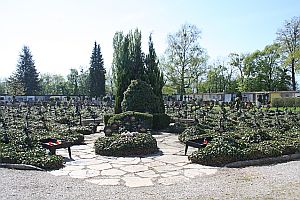 Im Stadtfriedhof; auf einer quadratischen Fläche, Matallkreuze mit Plakette