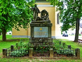 Rechteckiges Denkmal neben der Kirche gekrönt mit den Statuen