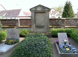 Sandsteinstele in Form eines Portals auf dem Friedhof an der westlichen Friedhofsmauer, link und rechts daneben Gräber von Gefallenen des 2. Weltkrieges