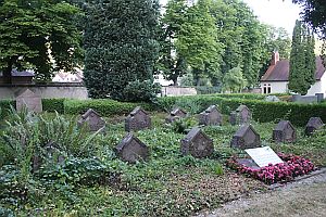 Im Friedhof zwei Reihen niedriger Steine (Inschriften nicht lesbar), dahinter grösserer Gedenkstein mit Inschriften,
