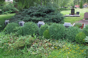 beide Weltkriege ohne Namensnennung, ein Gräberfeld mit sieben Einzelgräbern, ein Denkmal für