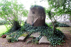 abgelegenen Ecke des Friedhofs steht ein monumentaler Naturstein mit aufgesetzten Metallbuchstaben zum