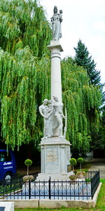 Metallzaun eingefriedet ist, steht die Plastik eines Soldaten mit Frau und Kind vor einer runden Säule die