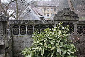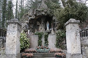 Bei der Kirche zwei Gedenktafeln vor der Lorettogrotte, Namenstafeln an der niederen Umfassungsmauer