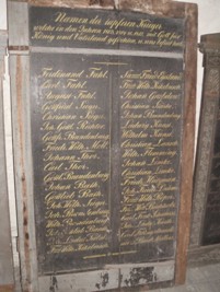 Die Gedenktafeln befinden sich nicht in der Kirche, sondern sind in einem Seitenraum abgestellt. Die Dienstgrade der Gefallenen sind meist mit dem schwer lesbaren Kürzel „dsgl.“ (desgleichen) gekennzeichnet, was sich auf darüber stehende Dienstgrade bezieht.