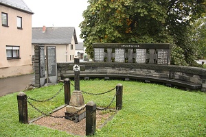 Kleiner Ehrenhain mit vier Gedenktafeln für den 1. Weltkrieg und 2 Stelen für den 2. Weltkrieg links