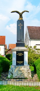 Stele gekrönt mit Adler auf Natursteinsockel neben der Kirche.