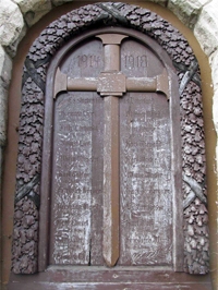 Geschnitztes Holzdenkmal für den 1. Weltkrieg am Pfarrhaus neben der evang. Dorfkirche St. Nicolai. Polierte gravierte