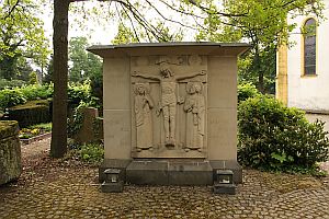 Im Friedhof Trier St. Matthias eine überdachte Gedenkwand, vorne ein Bildrelief, Inschriften und Jahreszahlen, hinten Namen