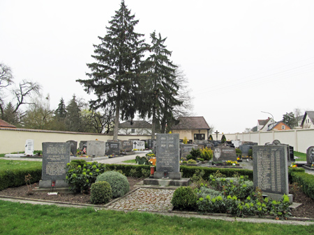 Drei gravierte Stelen aus poliertem Stein auf dem Ortsfriedhof hinter der kath. Kirche St. Wendelinus an der Durchgangsstraße.