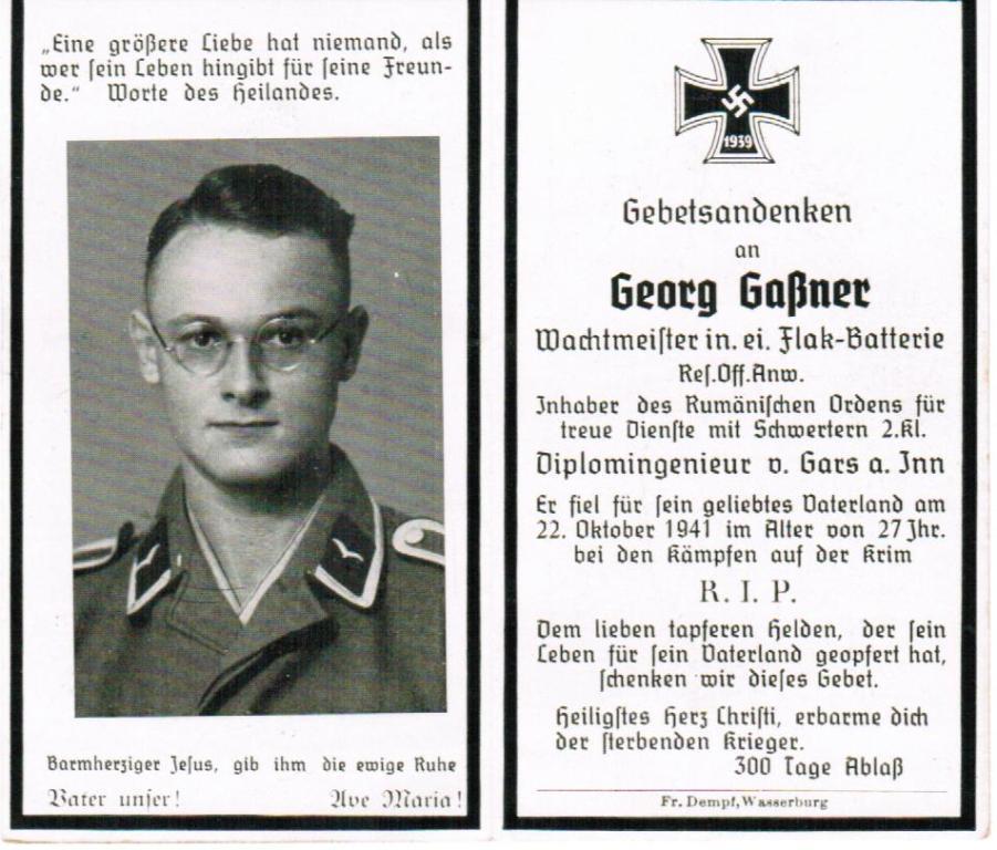 „Eine größere Liebe hat niemand, als wer sein Leben hingibt für seine Freunde“, Worte des Heilands Barmherziger Jesus, gib ihm die ewige Ruhe. Vater unser! Ave Maria! R.I.P. Dem lieben tapferen Helden, der sein Leben für sein Vaterland geopfert hat schenken wir dieses Gebet. Heiligstes Herz Christi, erbarme dich der sterbenden Krieger – 300 Tage Ablaß