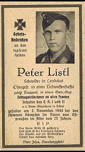 Schneider in Landshut. Obergefr in einer Luftwaffenstaffel zuletzt Truppent. In einem Gren.-Regt. Feldzugszeilnehmer an allen Fronten. Inhaber des E.K. I und II u.d. Verw.-Abzeichens in Silber. Gefallen bei den schweren Kämpfen im Raum von Ostpreußen im Alter von 25 Jahren.